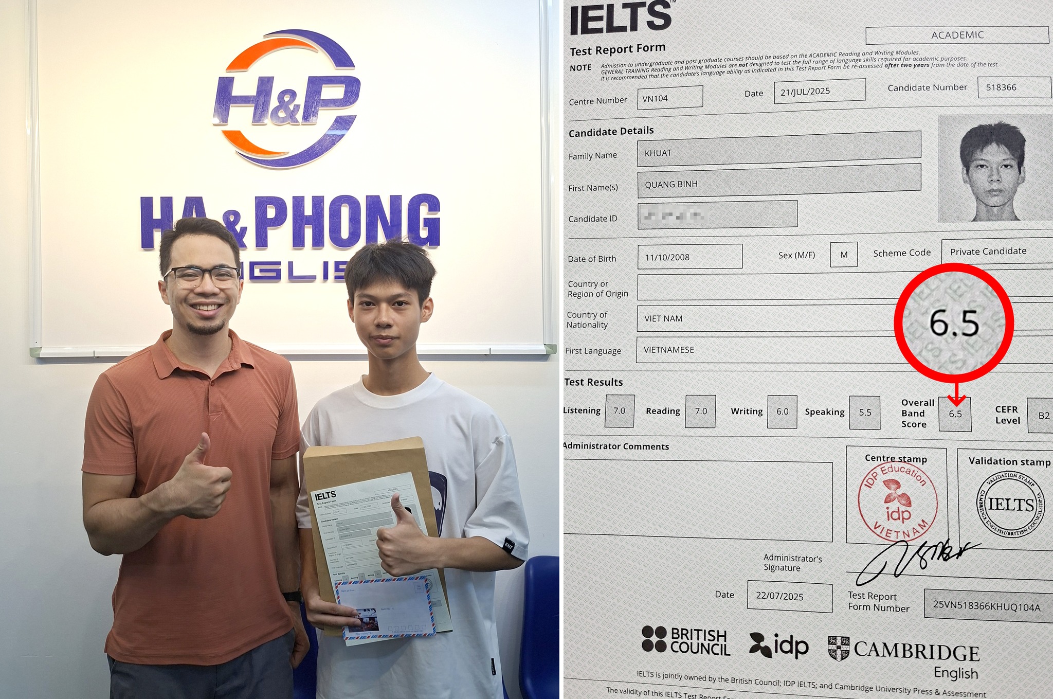 🎯Sau gần 1 năm học kiên trì, bạn đã xuất sắc đạt điểm 6.5, vượt mục tiêu ban đầu!